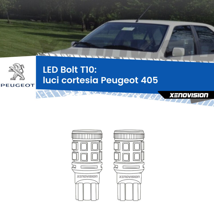 Coppia LED Luci Cortesia per Peugeot 405 1987 - 1997. Le lampade LED "Bolt" T10 per Luci Cortesia Peugeot 405 di Xenovision sono affidabili e luminose.